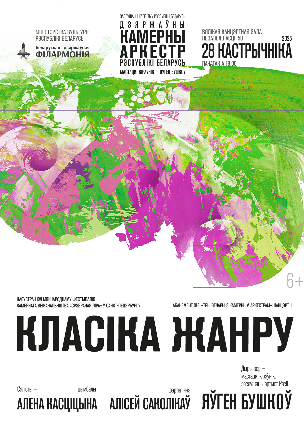 Первый концерт «Классика жанра» (28 октября) порадует публику бессмертным шлягером В.А.Моцарта – «Маленькой ночной серенадой», а также моцартовской Сонатой До мажор с аккомпанементом Э.Грига, оркестровку которого выполнил Евгений Бушков. Григовскую «тему» продолжит Сюита «Из времен Хольберга» для струнного оркестра, а дополнит эту классическую программу великолепный Концерт для цимбал с оркестром В.Курьяна. Солисты – Елена Костицына и восходящая звезда нового поколения белорусских пианистов Елисей Соколиков. У тех, кому не удастся попасть на эту программу в Большом концертный зал Белорусской государственной филармонии, будет возможность послушать ее 1 ноября 2025 года в Малом зале Санкт-Петербургской академической филармонии им. Д.Д.Шостаковича (в рамках фестиваля «Серебряная Лира»).