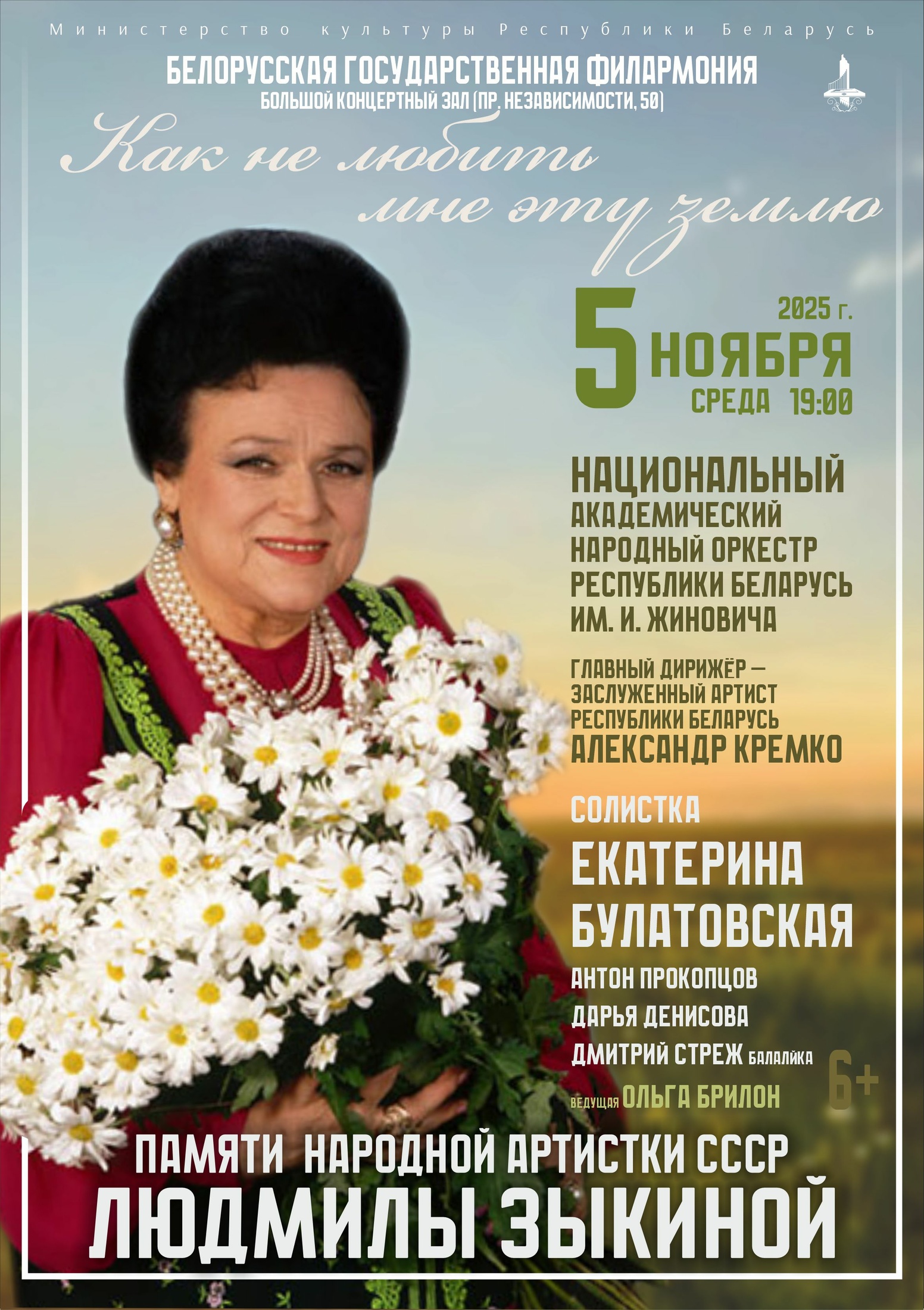 Памяти великой Людмилы Георгиевны Зыкиной посвящается концертная программа, подготовленная солисткой Екатериной Булатовской в сопровождении Национального академического народного оркестра Республики Беларусь им. И.Жиновича под руководством заслуженного артиста Республики Беларусь Александра Кремко. В концерте «Как не любить мне эту землю» на сцене Большого зала Белгосфилармонии прозвучат самые известные песни из репертуара певицы: «Течёт река Волга», «Оренбургский пуховый платок», «На побывку едет молодой моряк», «А где мне взять такую песню», «Ромашки спрятались» и многие другие.